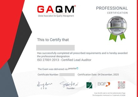 Certification : ISO 27001 : 2013 - Certified Lead Auditor