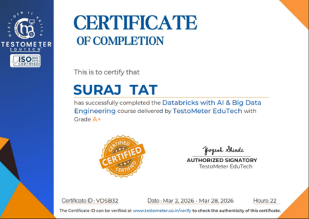 Yes, participants receive a Databricks with AI & Big Data Engineering certification from TestoMeter Pune after successful completion